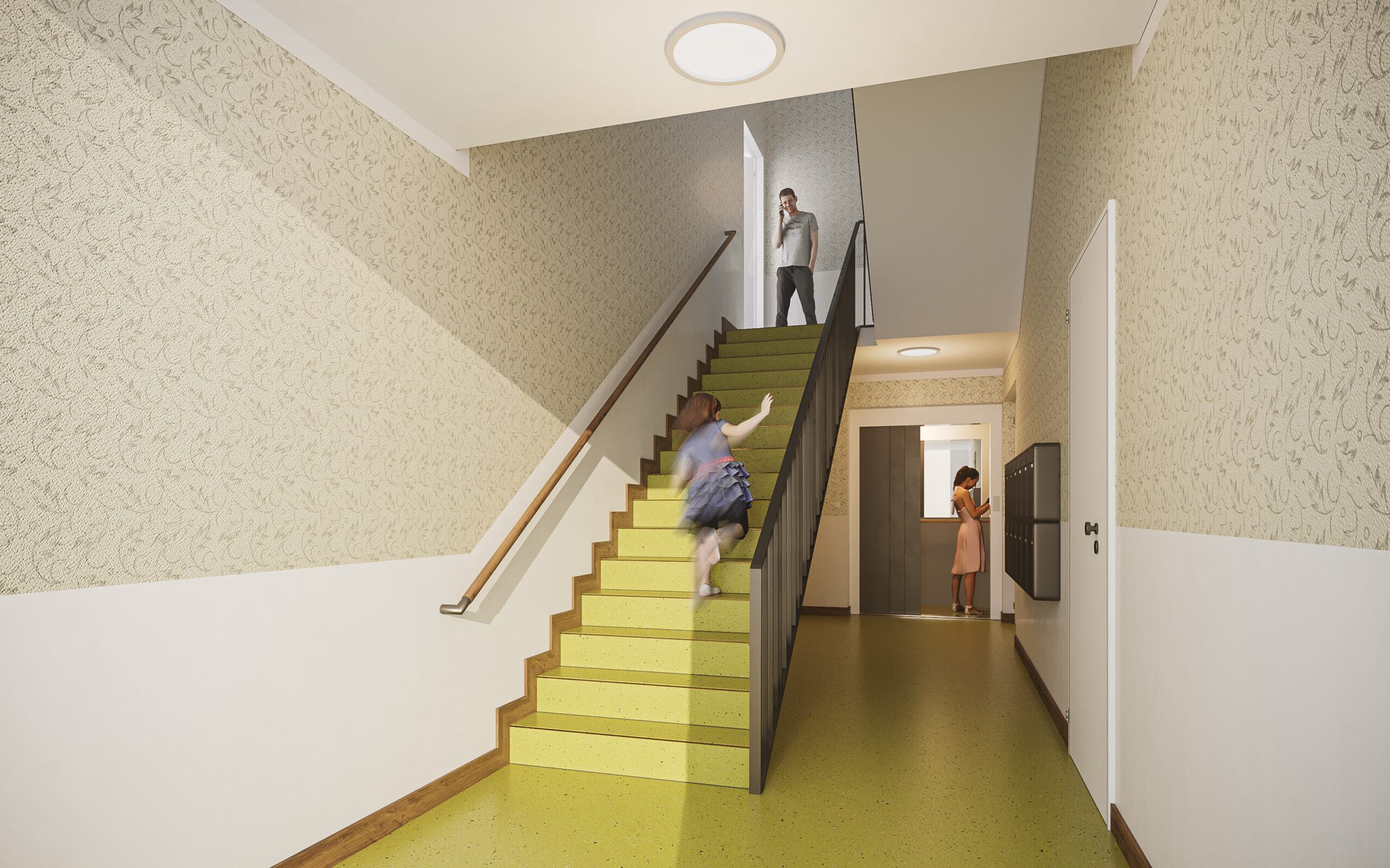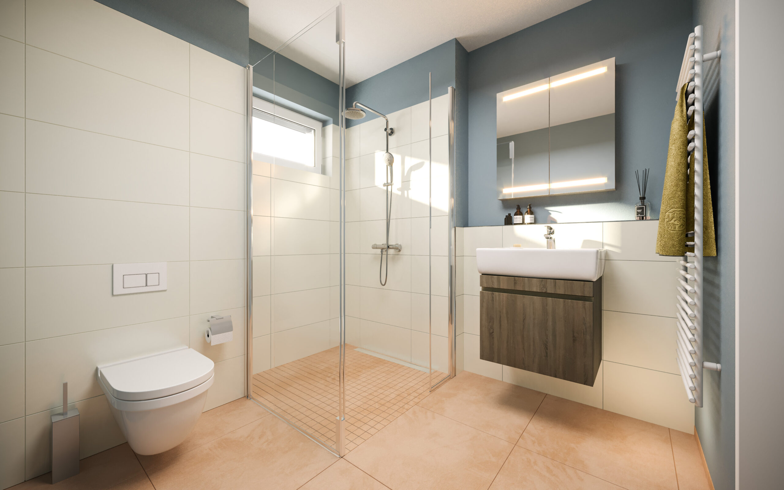 - Barrierefreiheit: Alle Wohnungen sind mit dem Aufzug erreichbar, einzelne sind barrierefrei nach DIN 18040-2 und mit bodengleichen Duschen ausgestattet.